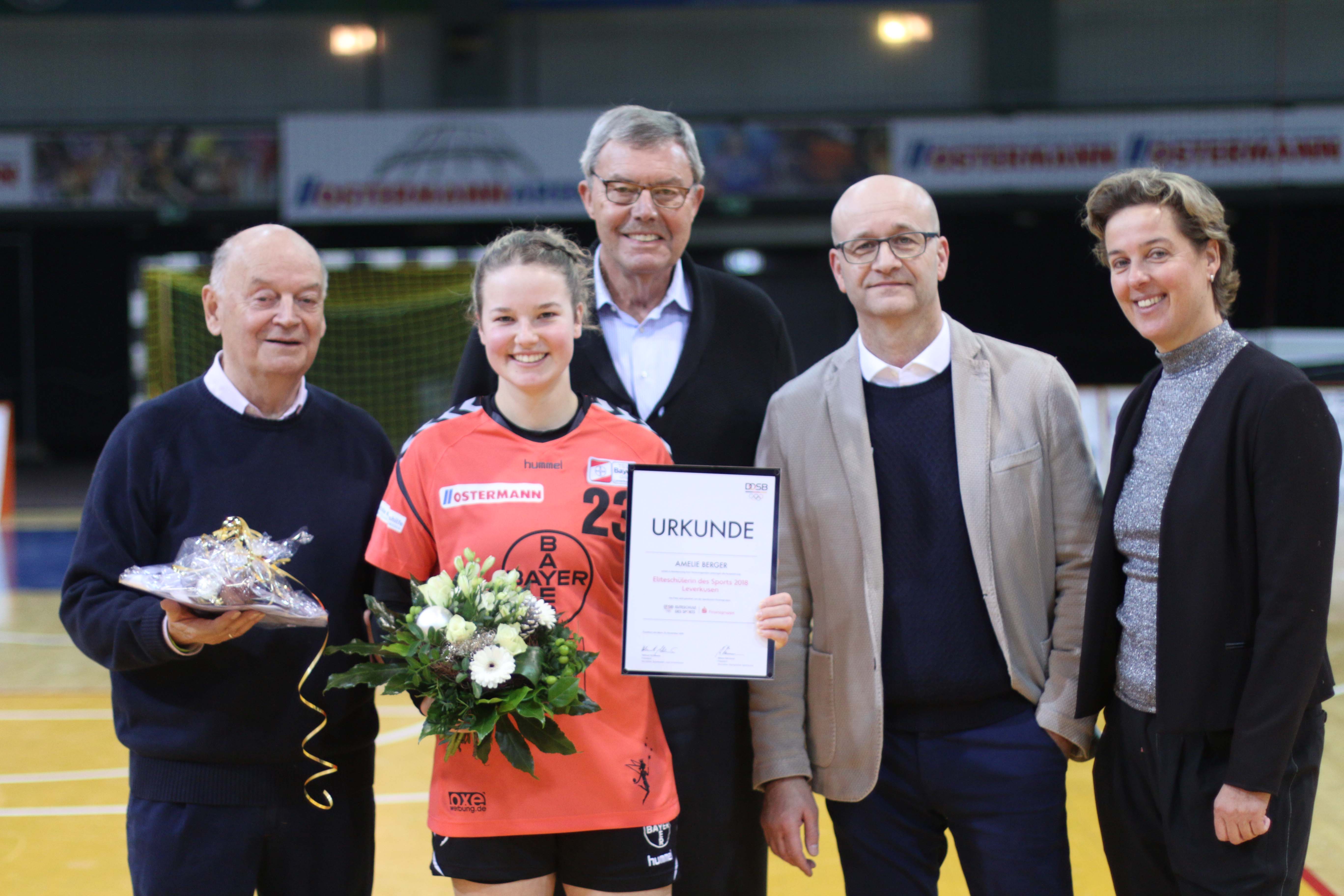 Eine besondere Ehrung gab es im Vorfeld des letzten Bundesligaspiels der Werkselfen für die Handballerin Amelie Berger. Die erfolgreiche Abiturientin des Leverkusener Landrat-Lucas-Gymnasiums von 2018 wurde vom Vorstandsvorsitzenden der Sparkasse Leverkusen, Rainer Schwarz, dem TSV Bayer 04-Vorsitzenden Klaus Beck, der Internatsleiterin Steffi Nerius und dem Vorsitzendes des Trägervereins des OSP Rheinland, Hans-Peter Meyer, als Eliteschülerin des Jahres 2018 ausgezeichnet. Die 19-Jährige ist mit den Juniorelfen in diesem Jahr Deutsche A-Jugend-Meisterin geworden, hat sich einen Stammplatz in der 1. Bundesliga bei den Werkselfen erkämpft und spielte eine wichtige Rolle bei der gerade zu Ende gegangenen Frauen-Europameisterschaft in Frankreich. Alles in allem ein herausragendes Jahr für die junge Handballspielerin und Abiturientin.
