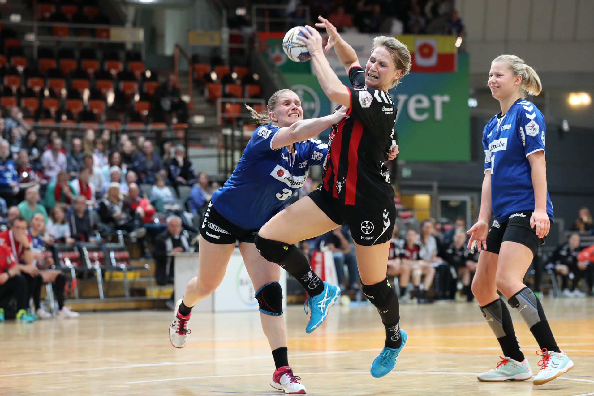 Zwei Spielerinnen waren es, die ihre Mitstreiterinnen regelrecht mitgerissen haben, und beide standen zunächst gar nicht auf dem Hauptplan. Vanessa Fehr, die nach einer Viertelstunde die diesmal glücklose Nele Kurzke zwischen den Pfosten ablöste, parierte im weiteren Spielverlauf bemerkenswerte 19 Würfe der Gäste. Zudem war es “Gigi” Jurgutyte, die erst mit der Beginn der zweiten Halbzeit überhaupt ins Geschehen eingriff, die immer wieder Verantwortung übernahm und mit starken acht Treffern in den zweiten 30 Minuten zur herausragenden Spielerin auf dem Feld avancierte. Bayer startete übernervös. Das 1:1 durch Xenia Hodel nach knapp 120 Sekunden sollte für lange Zeit der letzte Ausgleich bleiben. Die Gäste verteidigen intensiv und engagiert, weshalb die Elfen kaum einmal zu vernünftigen Abschlüssen kamen. Nach dem 1:1 blieben sie über sieben Minuten lang ohne eigenen Treffer und mussten nach dem 4:10 (18. Minute) sogar einem Sechs-Tore-Rückstand hinterherlaufen. Das taten sie mit allen Kräften, die man am Ende einer Saison noch irgendwie mobilisieren kann, wenn auch zunächst noch glücklos. Der immense Kraftaufwand schien sich aber zu rentieren, denn nach 28 Minuten war man wieder bis auf zwei Tore dran (10:12).