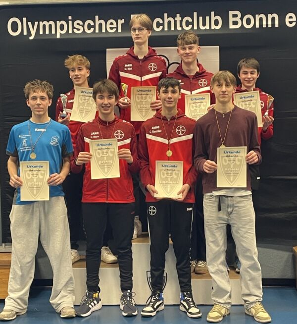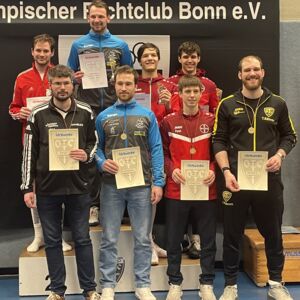 Als letztes gingen die U17-Herren an den Start. Hier sicherte sich Leverkusen nicht nur das gesamte Treppchen, sondern noch zwei weitere Finalplatzierungen. Damit gingen von 8 geehrten Plätzen 6 an den TSV. Die Leverkusener trafen in diesem Wettkampf schon früh aufeinander und schmissen sich gegenseitig aus dem Wettkampf, was noch weitere gute Platzierungen verhinderte. Moritz Nick sicherte sich am Ende die Goldmedaille. Lenny Gerlach unterlag ihm im Finale mit 15:12. Bruno Marchet und Tristan Hofsommer verloren beide gegen ihre Vereinskollegen und teilten sich den dritten Platz. Komplettiert wurde das gute Ergebnis durch die beiden U15-Fechter Henry Meyer auf Platz 6, der ebenfalls gegen einen Vereinskameraden verlor, und Cosimo Gonzalez auf Platz 7.
