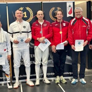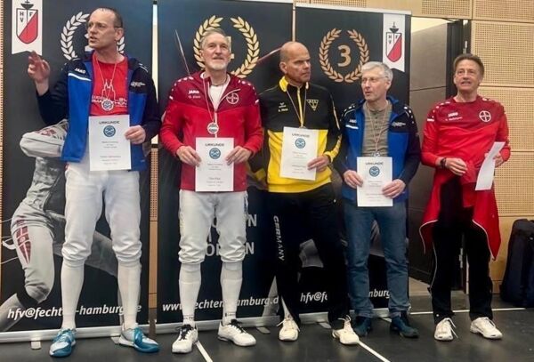 Bei den Herren gingen insgesamt drei Leverkusener Fechter an den Start. In der V50 erreichte Alexander Marchet das Treppchen und holte die Bronzemedaille nach Leverkusen. In der V60 musste sich Achim Bellman knapp (7:6) gegen seinen Vereinskollegen Oliver Klass geschlagen geben und holte Platz 5.