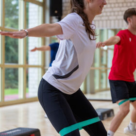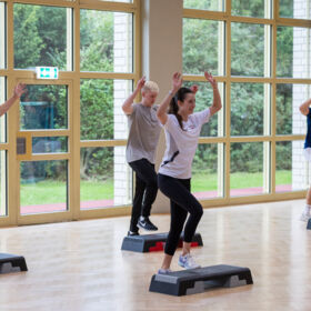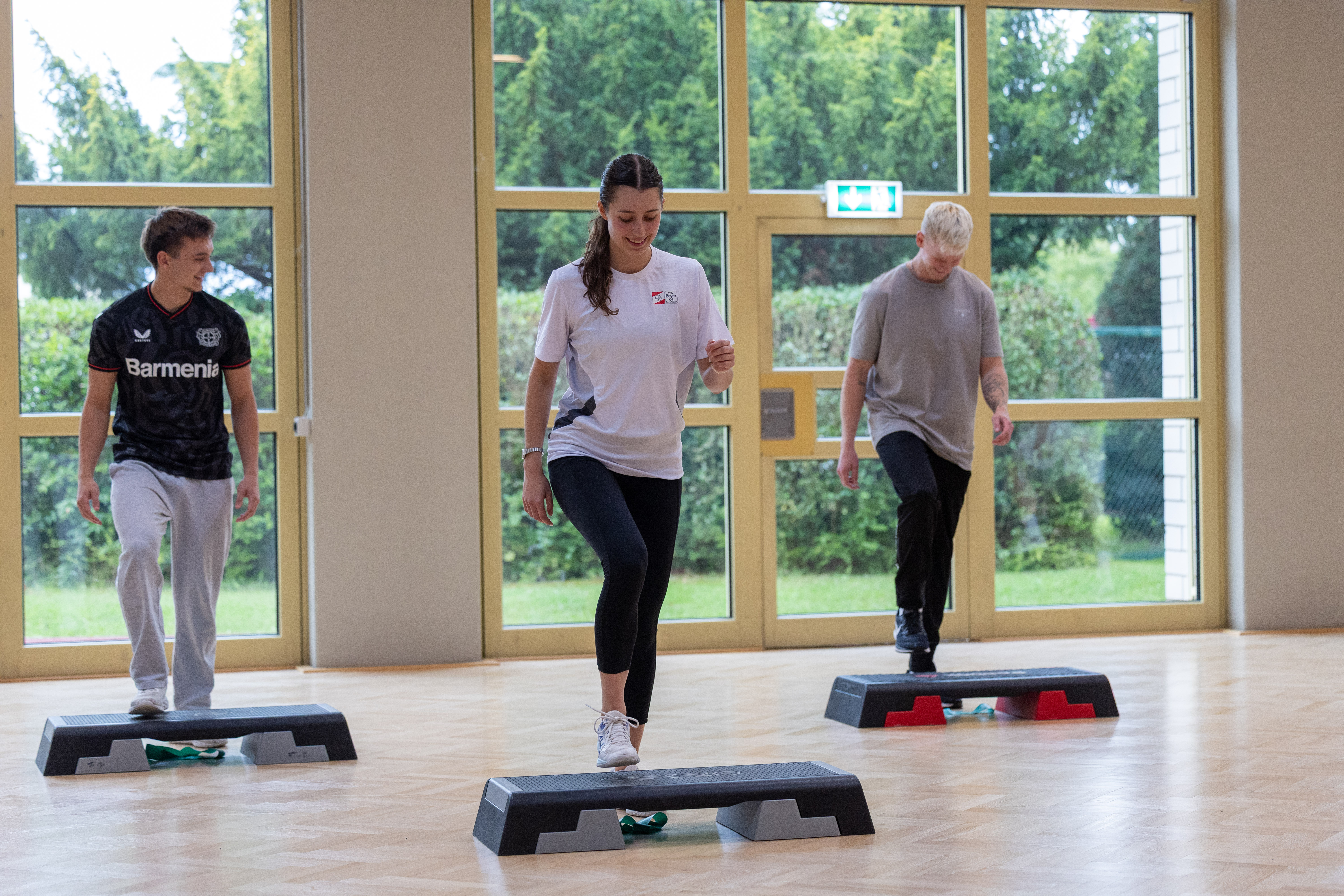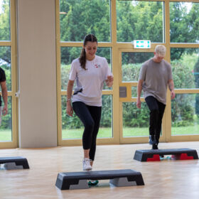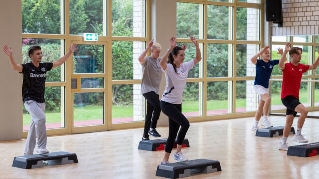 Eine Kombination aus Ausdauer mit leichten Step-Choreographien und Kraft mit Einsatz des Steppers und Kleingeräten.